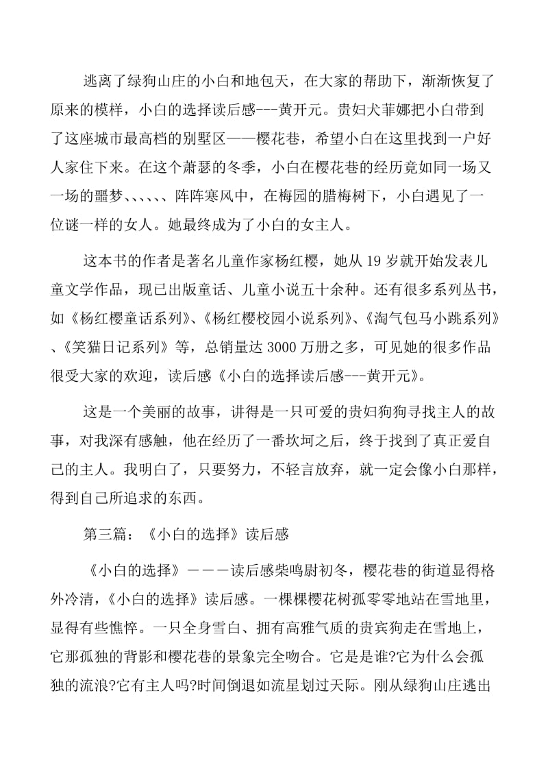 【正文】白遇见了一位像谜一样的美丽的女人,她就是小白的女主人。读了这本书我的读后感是:做任何事都要赞同自己的意见,也要听一听别人的意见。《小白的选择》 200 字读后感 6我已经读过很多本杨红樱写的《笑猫日记》,我非常 喜欢读她写的书。《小白的选择》读后感《小白的选择》这个故事主要是说小白想要找一个好人家住下,笑猫、菲娜、球球老老鼠一起帮助小白寻找好人家。可是小白在这里的经历却如同一场恶梦,又一场恶梦。它的朋友很伤心,我也很伤心。文章给我留下印象最深的就是阿贝哥把小白放在了一个黑色的垃圾袋里,扔进了垃圾桶。《小白的选择》读后感而菲娜就从垃圾桶里把小白拖了出来,跟笑猫、球球老鼠一起把小白运回了美丽的翠湖公园。但是小白并没有死,它只是晕倒了,又被它的好朋友给救了。我很同情小白,也很为它伤心,而它的好朋友们为 它做的事情让我感受到了它们之间深深的友情!《小白的选择》 200 字读后感 7这个寒冷的冬季,小白开始了选择主人的行动„„在影星阿贝哥家里,阿贝哥家里和外面判若两人。他在外面对妻子百般温柔,在家却大吼大叫,仿佛是两个人。小白在他家里与生死相斗,站在了边缘。在寄生虫似的夫妇家里懒洋洋地混着日子,什么事也不做小白的选择主要内容,越长越胖。面善心不善的“寄生虫”夫妇遗弃了心肝儿,喜欢了小白,让心肝儿身也凉,心也凉。笑猫他们安顿好它后又去忙小白的事了。后来在梅花园中,小白遇见了像谜一样的那个女人。因为她很善良 ,也很喜欢小白,所以小白在那儿安了家。在这过程中小白长大了许多,犹如毛毛虫蜕变成了蝴蝶。在这期间小白的选择主要内容,是她让它学会了责任感。同样,他们让我学会了真情,信任小白的选择主要内容,珍惜,成长„„《小白的选择》 200 字读后感 8在这里小白有三种选择,这三户人家都是菲娜找的。第一个是大明星阿贝哥家,认知道新闻里所有关阿贝哥的事全都是假的,因为他们的生活就是在演戏;第二个是菲娜的领导两个寄生虫,吃完了就睡,睡完了就吃小白的选择:寻找好人家的波折经历与深厚友情,最后小白吃成了大胖子;第三个人家是表面上慈眉善目的老夫妇,可是做事却如何狠毒。尽然把年老的“心肝儿”丢在一个没有人知道的地方。哎!笑猫本来是想让小白去马小跳家呢。可是他们最后还是没有去。小白最后的主人是像谜一样的女人,长得还很漂亮。哦!在这里告诉大家,这本书很好噢!希望大家能和我一起分享读书的快乐。第二篇:《小白的选择》 200 字读后感《小白的选择》 200 字读后感 1今天,我看了一本杨红樱写的《小白的选择》小白的选择:寻找好人家的波折经历与深厚友情,让我产生了许多想法。想知道吗?想,跟我来吧!读了这本书,我知道了杨红樱作家是四川省作家协会副主席,曾做过小学老师、儿童读物编辑和儿童刊物主编。 19 岁开始发表儿童文作品,现已出版出版童话,儿童小说„„现在就说感受了。我读这本书的感受是:里面的人物都和睦相处,有困难一起思考,先人后己,助人为乐。如果我家也是这样的话,我们就会过得很幸福!现在,我就给大家介绍一下 故事里我最喜欢的动物:菲娜,她很爱打扮。今天的头发是红色,明天的头发是绿色„„跟我一样,在家里穿得花枝招展,我是张彦还是花了?希望大家喜欢这本书小白的选择:寻找好人家的波折经历与深厚友情,请记住书籍名《小白的选择》。《小白的选择》 200 字读后感 2暑假,我读了一本书名叫《小白的选择》的书,它的作者是杨红樱。这本书主要讲了一只名叫小白的贵妇狗寻找它的主人,它的朋友,菲娜和笑猫一起帮它寻找主人,菲娜给小白介绍了三户人家:面善心不善的影视明星阿贝哥,不劳而获的两个“寄生虫”和喜新厌旧的一对夫妻。在阿贝哥家,小白为了救 阿贝