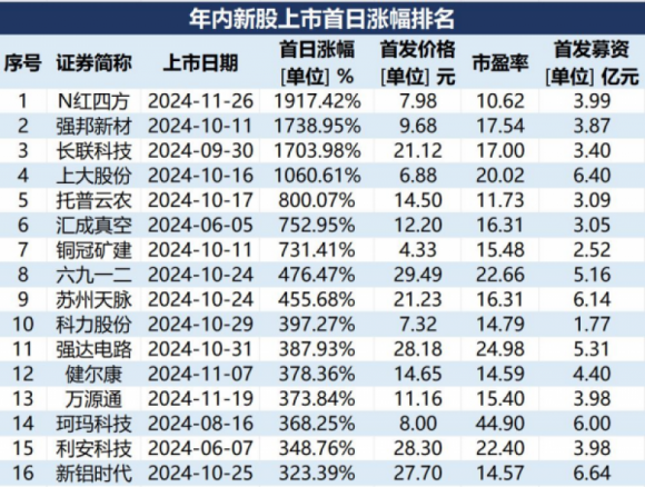 年内新股上市首日涨幅排名(数据截至11月26日)A股震荡调整之际,新股市场持续火热。11月26日,N红四方在沪市主板上市首日大涨超19倍,刷新年内新股首日涨幅纪录,按照收盘价计算...